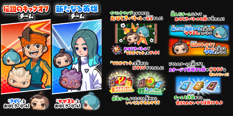 - Guía rápida del evento: Supera fases del evento para que aparezcan niveles de ohajiki, como en cualquier evento con este formato. Al completar estos niveles, conseguirás VS Points, que te permitirán obtener recompensas individuales y de equipo. Para ello, deberás elegir uno de los siguientes equipos: Kickoff Legends o New Heroes.